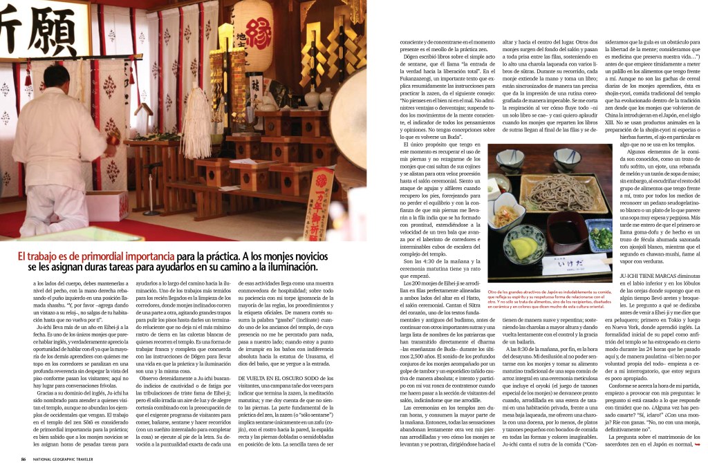“There are three positions when you are in a Zen temple,” Ju-ichi tells me as we kneel on the tatami mats in my otherwise empty room, “sitting, standing and walking.”  We must always definitely be doing one of the three, and when moving around, the hands, instead of being thrust into the pockets or swinging by one’s side, are to be held at chest level, with the right hand eclipsing the left fist in a position called shasshu. “And please,” he adds, glancing at his watch, “do not move from your room until I come to get you.”